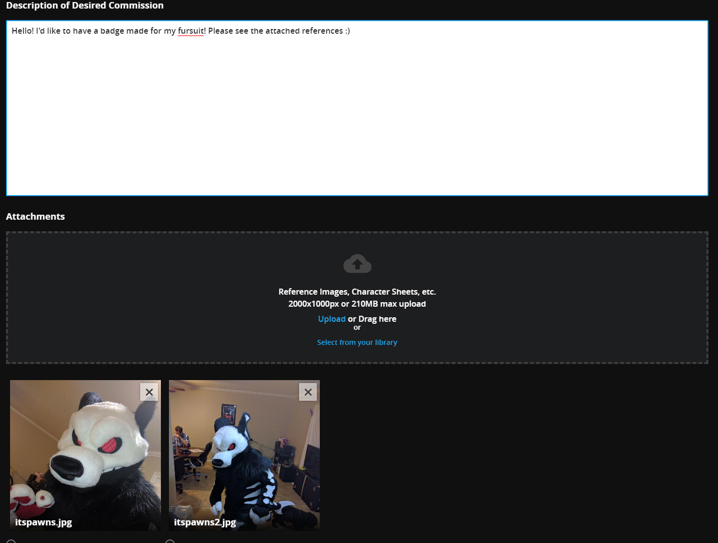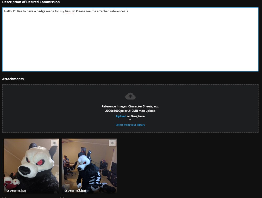 The “request” screen currently supports the direct upload of references, so that artists and commissioners do not need to fumble around with links and worry about having to search around for them. They are all in one place! Future plans have us expanding out this system. All communication is handled through the internal system of communications we have, which includes the ability to share WIP pictures directly and swap updates quickly and efficiently, so that every part of the commission process is in one place.